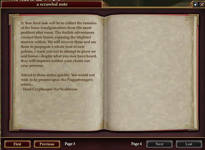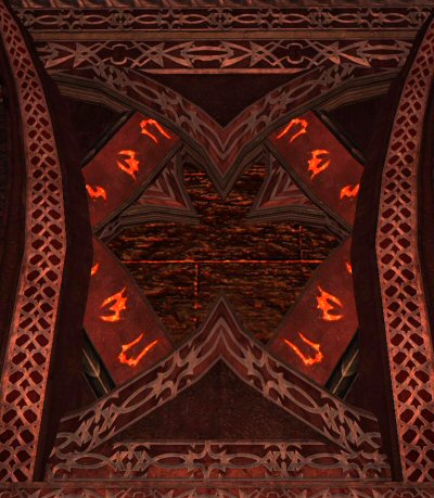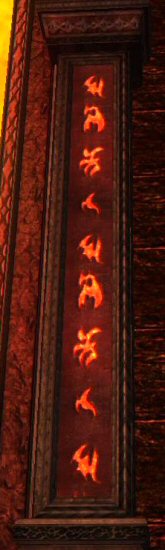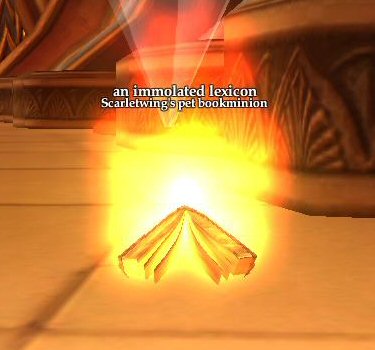 Hail The Immolated Lexicon at the north end of that entry room and have a roundabout conversation with it that eventually leads to it agreeing to follow you and translate the runes. This adds the spell to your knowledge book to "Summon Immolated Lexicon" (As you'll see further below, you get to keep it as a fluff pet after the quest is complete.) Summon it and head for the runes on the walls (both types pictured below.) Don't just head to the runes, summon the lexicon, otherwise clicking the runes won't do you any good. ;D