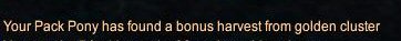 Also, when you run around with your pony summoned (or even when you are low-flying), he can grab an extra harvest from a node that you pass and dump it in your bags. This can occur every 90 seconds, and will not work if you just stand and afk at a node. You have to be actively moving around and dragging him past fresh nodes. He CAN do this with rares as well as common harvests. It does NOT decrease the harvests available on the node for whomever physically harvests the node, only gives you an extra bonus of 2 or more of a given resource. While the best way to explain it seems to be that it is like having an ample harvest proc on a node without actually having to harvest, my own mental image is of Skippy the Wonder Pony backing up to a nearby node, planting his front feet, and kicking out with both back hooves, knocking a harvest loose and straight into your bags.
