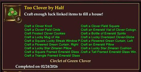 This achievement requires the crafting of several luck-related items that can be found within the Brewday Accoutrements to Craft recipe book series. It rewards a Circlet of Green Clover appearance headpiece. It also unlocks the ability to purchase the Blessed version of the Emerald Lantern Broom (pictured above in the Buyable section.